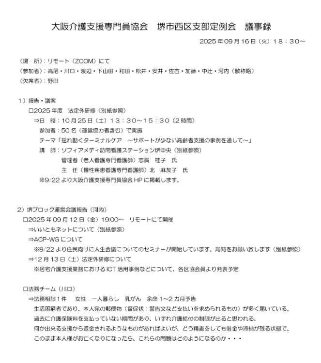 2025年9月16日 大阪介護支援専門員協会 堺市西区支部定例会 議事録