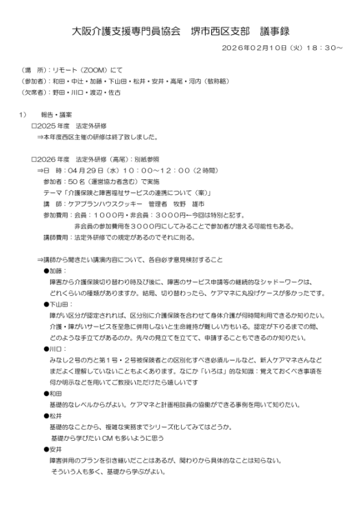大阪介護支援専門員協会 堺市西区支部 議事録 2026年1月13日