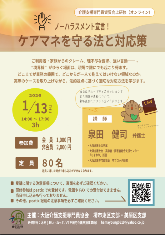 介護支援専門員資質向上研修(オンライン)ノーハラスメント宣言! ケアマネを守る法と対応策
